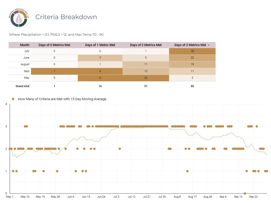 Of 153 summer days, 56%, or 85 summer days, met all three criteria for ideal precipitation, air quality, and temperature.