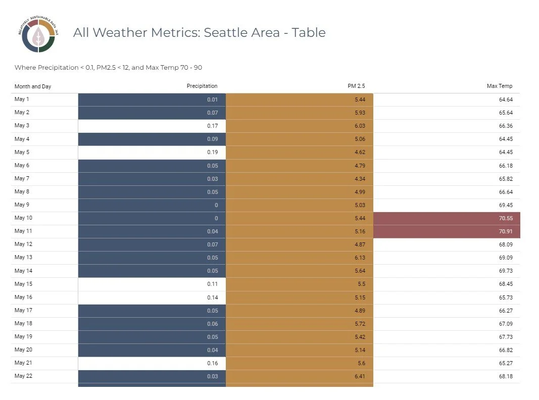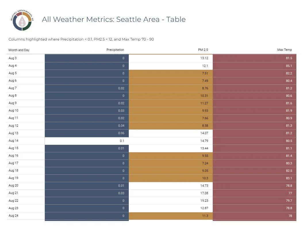 This post outlines an analysis to determine how many Temperate, Not Rainy, Not Smoky Seattle Summer Days (TNRNSSSDs) there are on average in a year, and when they’re most likely to occur. The goal of these days is not that they’re “perfect” Seattle summer days, but that you can go outside without any weather concerns. (Jump ahead for results if you’re in a hurry).